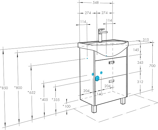 Комплектация: тумба, раковина, зеркало, ножка (2 шт.), крепеж.
