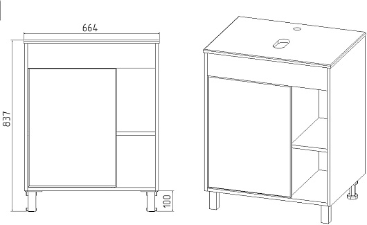 - 1 распашная дверца, 2 открытые полки.