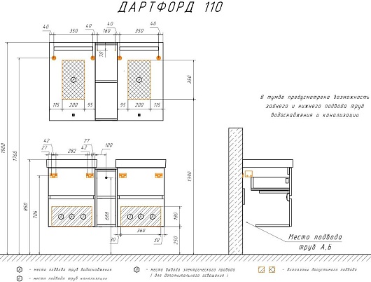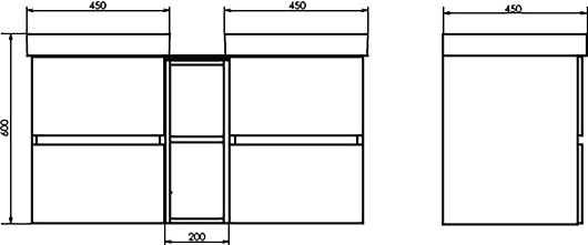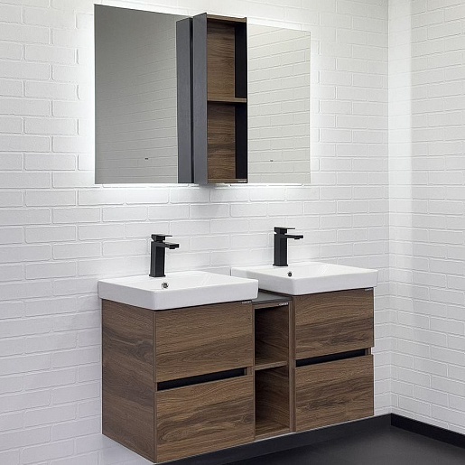 В комплекте: тумба (2 шт.), шкаф-вставка для тумбы, раковина (2 шт.), зеркало (2 шт.), шкаф-вставка для зеркала, крепеж.
