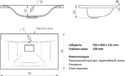 - Раковина из литьевого мрамора со слив-переливом.