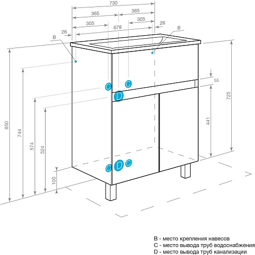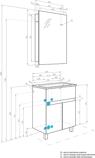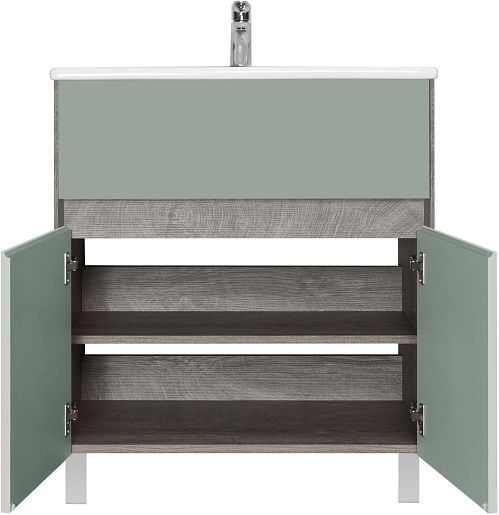 Комплектация: тумба, раковина, зеркальный шкаф, ножка (2 шт.), крепеж.