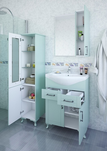 В комплекте: тумба, раковина, зеркальный шкаф, ножка (3 шт.).