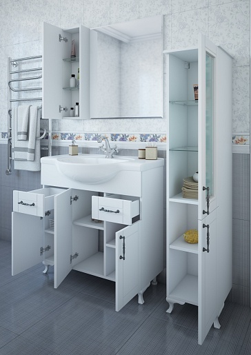 В комплекте: тумба, раковина, зеркальный шкаф, ножка (4 шт.).
