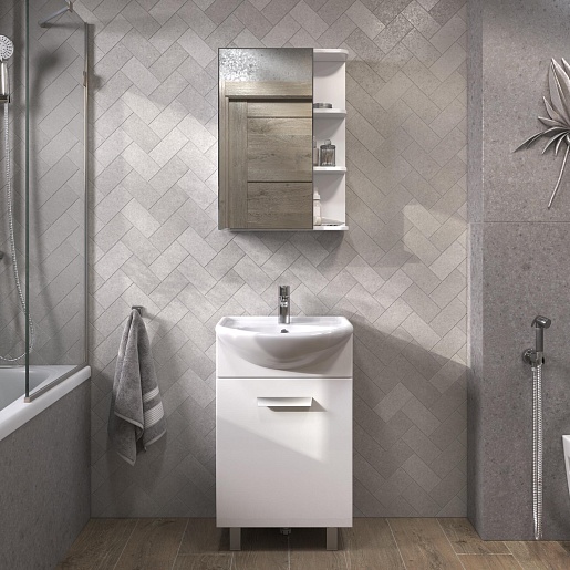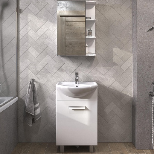 В комплекте: тумба, раковина, зеркальный шкаф, крепеж, ножка (3 шт.).