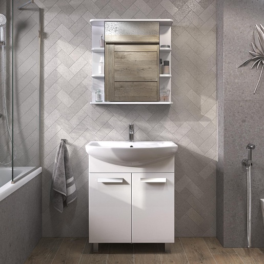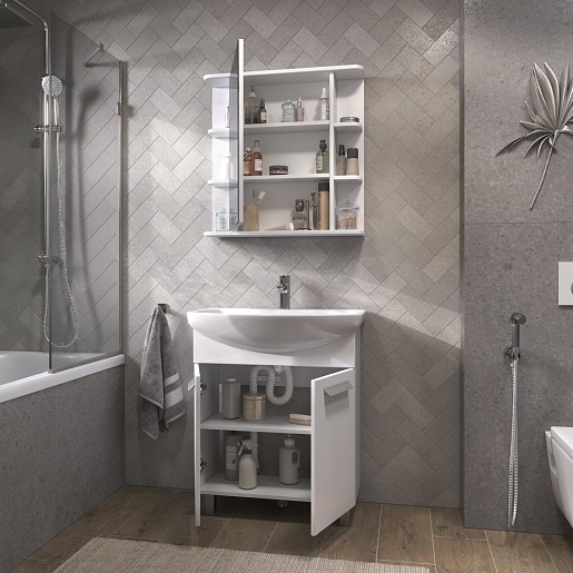 В комплекте: тумба, раковина, зеркальный шкаф, крепеж, ножка (3 шт.).