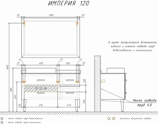 В комплекте: тумба, столешница, раковина, зеркало, комплект креплений, ножки.