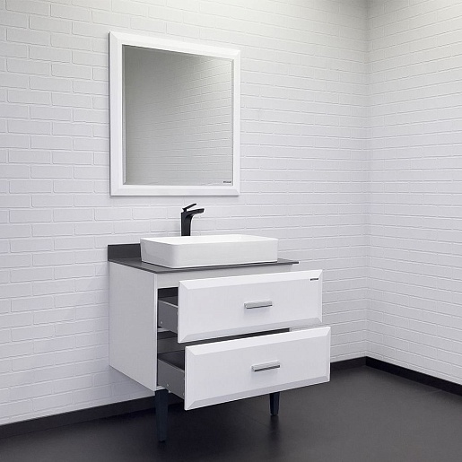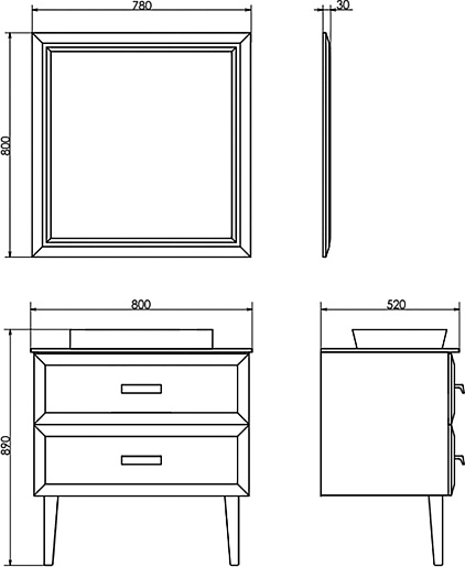 В комплекте: тумба, столешница, раковина, зеркало, комплект креплений, ножки.
