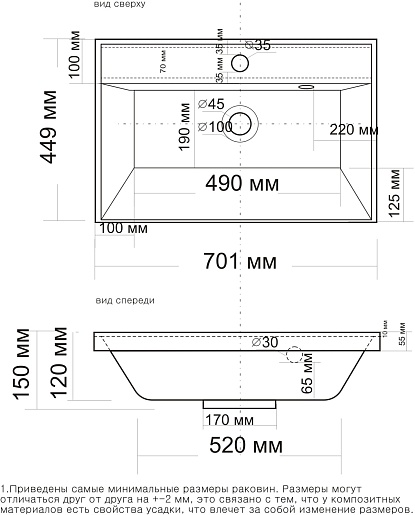 - Раковина из литьевого мрамора со слив-переливом.