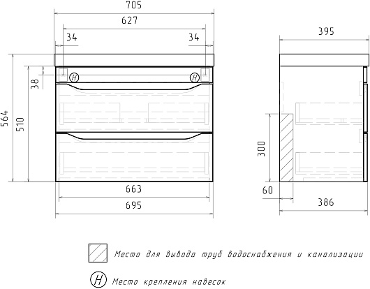 Подвесная тумба с раковиной Volna Lake 70.2Y - арт. tpLAKE70.2Y-01 / 9696-70.