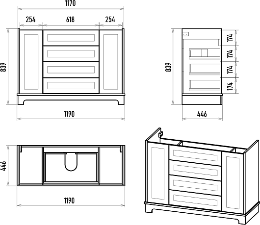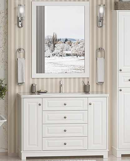 В комплекте: тумба, раковина, зеркало, крепеж, ножки.