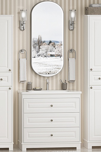 В комплекте: тумба, раковина, зеркало, крепеж, ножки.