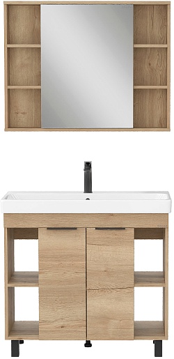В комплекте: тумба, раковина, зеркальный шкаф, ножки, крепеж.