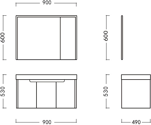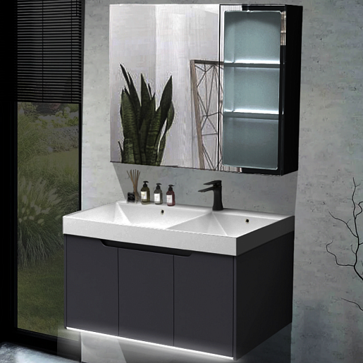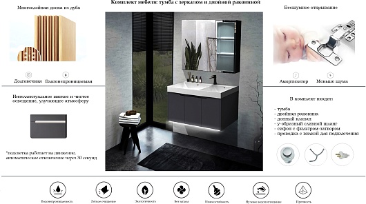В комплекте: тумба, раковина, донный клапан (2 шт.), зеркальный шкаф, сифон с фильтром-затвором (2 шт.), У-образный сливной шланг, вилка для подключения подсветки, крепеж.