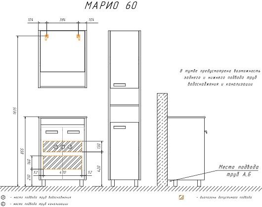 В комплекте: тумба, раковина, зеркальный шкаф, комплект ножек.