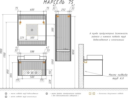В комплекте: тумба, раковина, столешница, зеркало, крепеж.