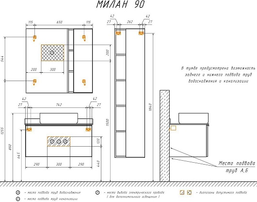 В комплекте: тумба, раковина, столешница, зеркальный шкаф, крепеж.