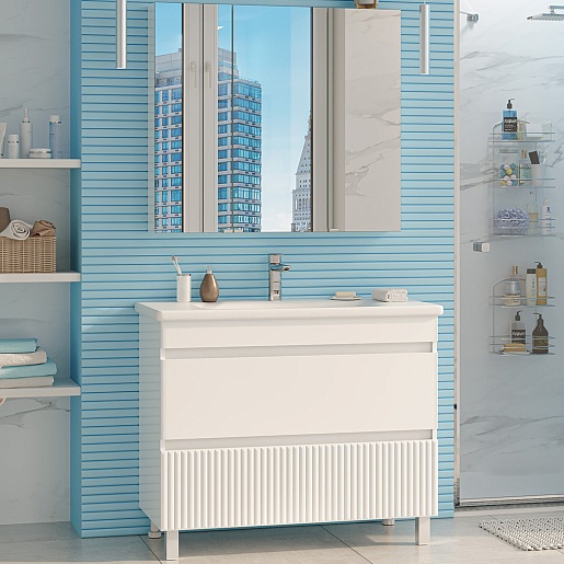 В комплекте: тумба, раковина, зеркальный шкаф, ножка (4 шт.).