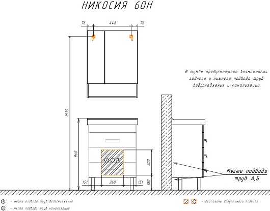 В комплекте: тумба, раковина, зеркальный шкаф, ножка (4 шт.).