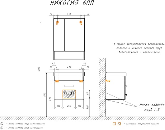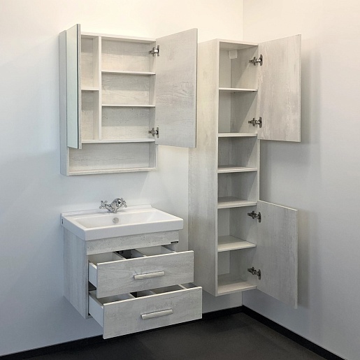 В комплекте: тумба, раковина, зеркальный шкаф, крепеж.