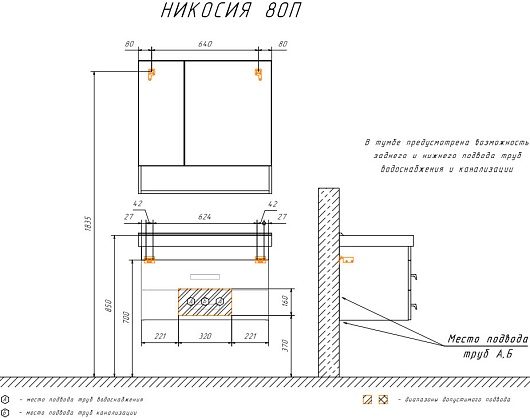 В комплекте: тумба, раковина, зеркальный шкаф, крепеж.