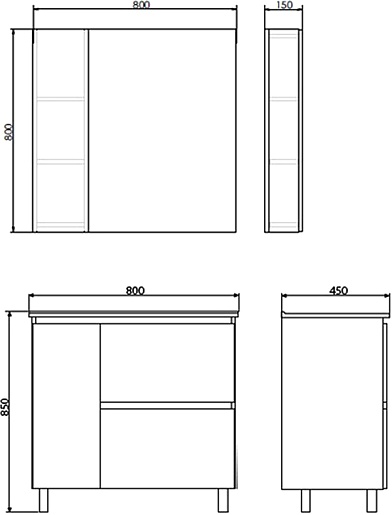В комплекте: тумба, раковина, зеркальный шкаф, комплект ножек.