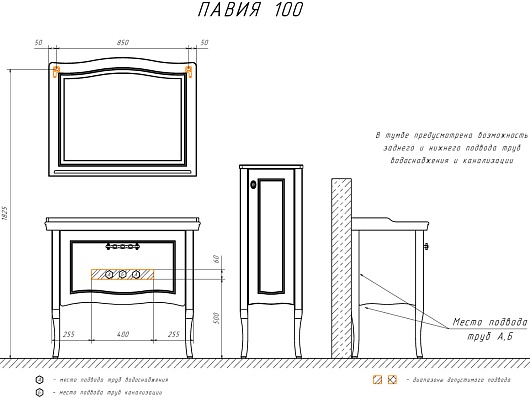 В комплекте: тумба, раковина, зеркало, ножки.