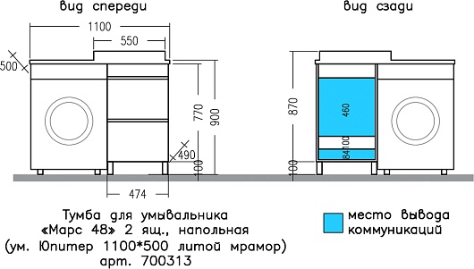Напольная тумба с раковиной под стиральную машину Санта Марс 110 R - арт. 700313 / 900132 / 900123.