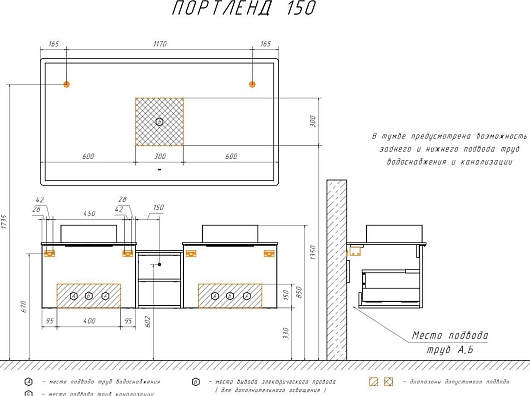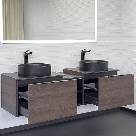 В комплекте: тумба Портленд 60 (2 шт.), тумба с нишей, раковина (2 шт.), столешница, крепеж.