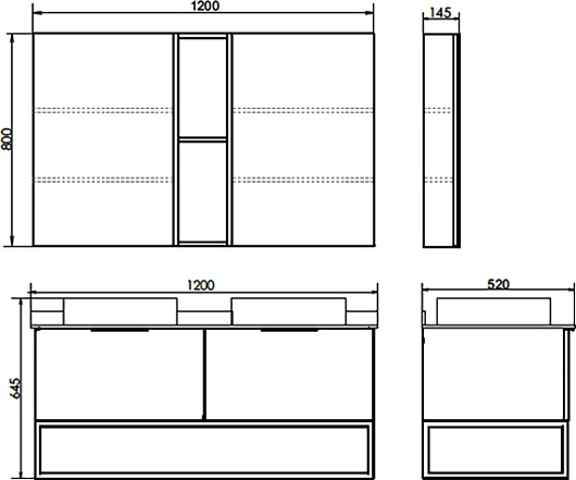 В комплекте: тумба, раковина, столешница, зеркальный шкаф, навесной шкаф, крепеж.