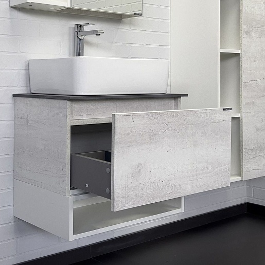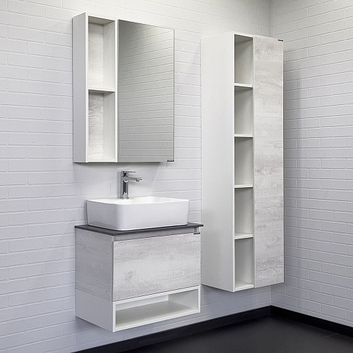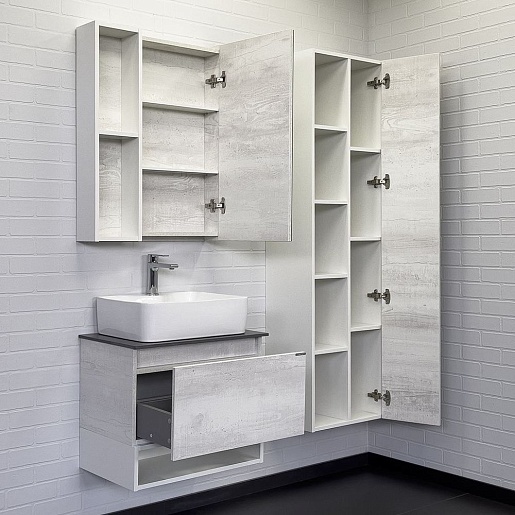 В комплекте: тумба, столешница, раковина, зеркальный шкаф, крепеж.