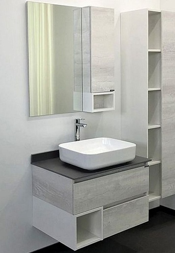 В комплекте: тумба, столешница, раковина, зеркальный шкаф, крепеж.
