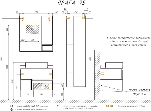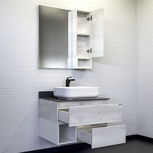В комплекте: тумба, столешница, раковина, зеркальный шкаф, крепеж.