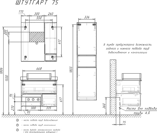 В комплекте: тумба, раковина, зеркальный шкаф, крепеж.