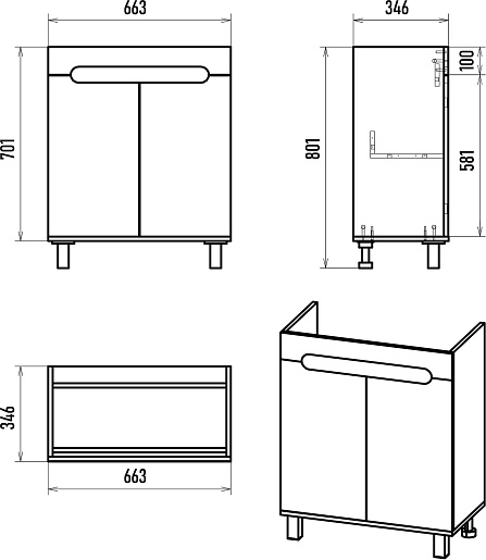 В комплекте: тумба, раковина, зеркало, крепеж, ножка.