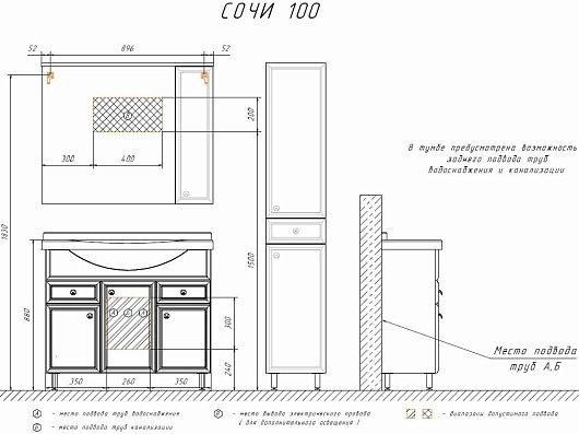 В комплекте: тумба, раковина, зеркальный шкаф, комплект ножек.