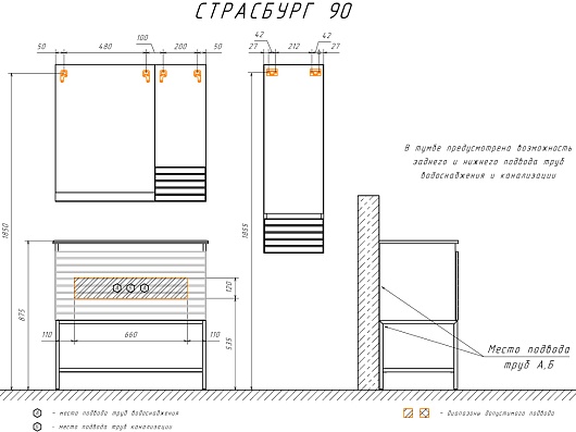 В комплекте: тумба, раковина, зеркальный шкаф, ножки.
