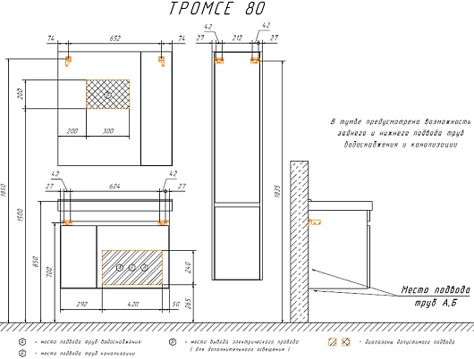 В комплекте: тумба, раковина, зеркальный шкаф, крепеж.