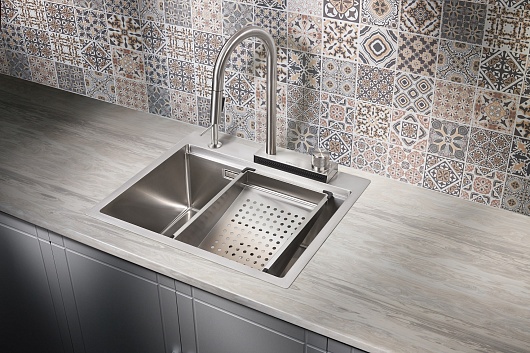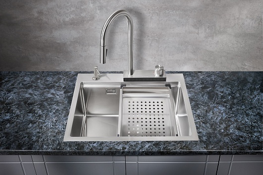 В комплекте: мойка, сифон со слив-переливом, смеситель, коландер.