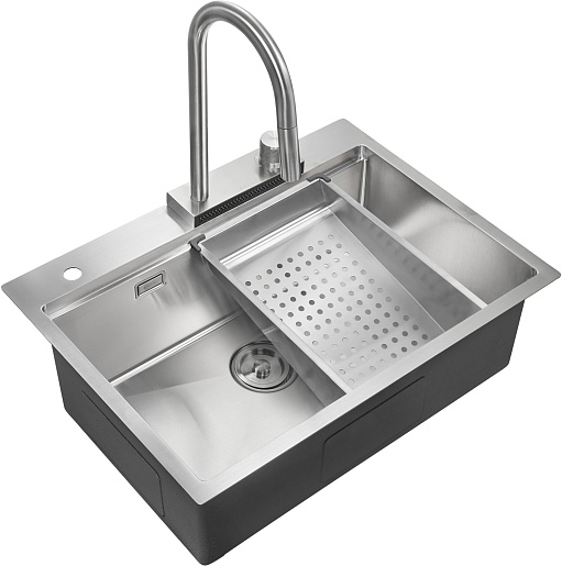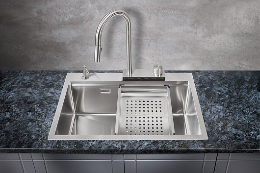 В комплекте: мойка, сифон со слив-переливом, смеситель, коландер.