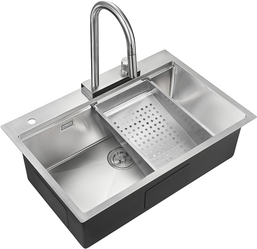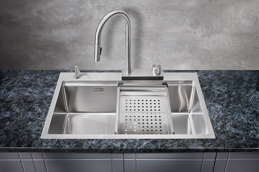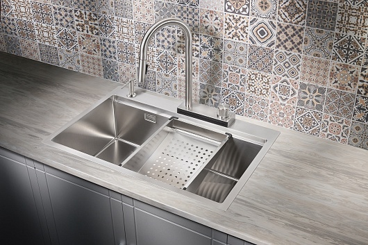 В комплекте: мойка, сифон со слив-переливом, смеситель, коландер.