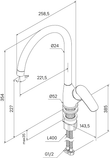 - Гибкая подводка из нетоксичной EPDM резины в оплетке из нержавеющей стали, М10 - G1/2.