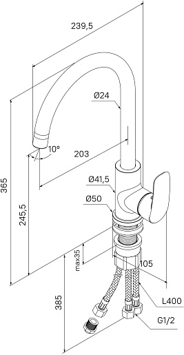 - Гибкая подводка из нетоксичной EPDM резины в оплетке из нержавеющей стали, М10 - G1/2.