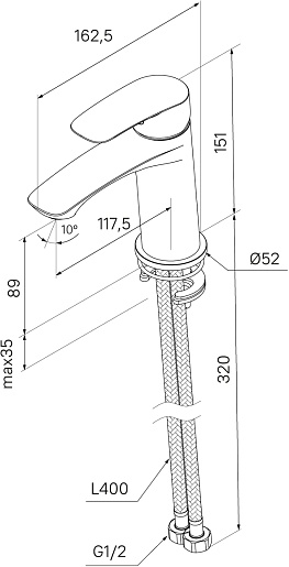 - Гибкая подводка из нетоксичной EPDM резины в оплетке из нержавеющей стали, М10 - G1/2.