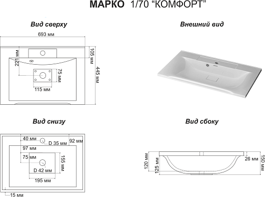 В комплекте: тумба, раковина, зеркало, ножка (4 шт.), подвесы (2 шт.).