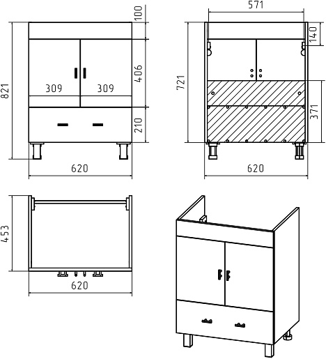 Комплектация: тумба, раковина, зеркальный шкаф, комплект креплений, ножка (4 шт.).