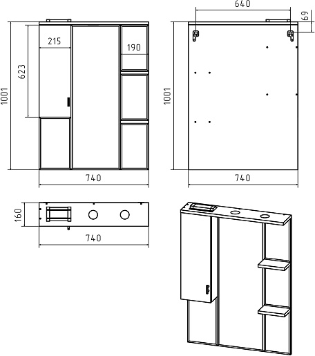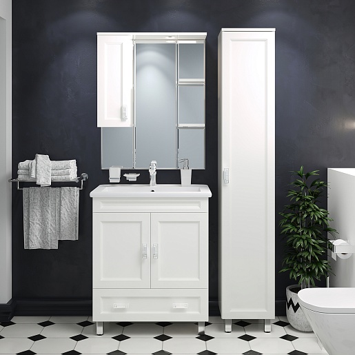 Комплектация: тумба, раковина, зеркальный шкаф, комплект креплений, ножка (4 шт.).
