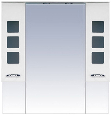 Комплектация: зеркальное полотно с козырьком со встроенной подсветкой, выключателем и розеткой. Распашные шкафчики со вставками из матового стекла и вкладной полкой.