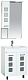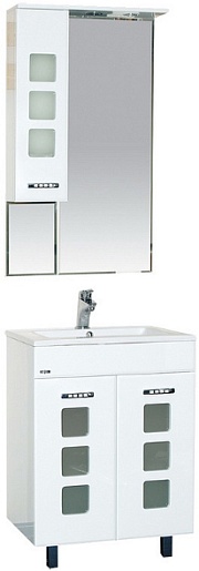 Комплектация: зеркальное полотно с козырьком со встроенной подсветкой, выключателем и розеткой. Распашной шкаф со вставками из матового стекла и вкладной полкой.