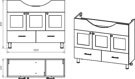- Габариты корпуса тумбы (ШxГxВ): 1050x330x850 мм.