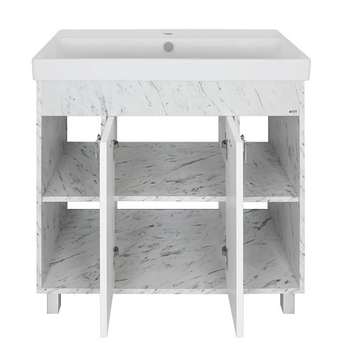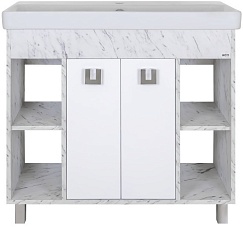 - Тумба под раковину Мия 90: распашные фасады, открытые полки, доводчики, фурнитура-хром.